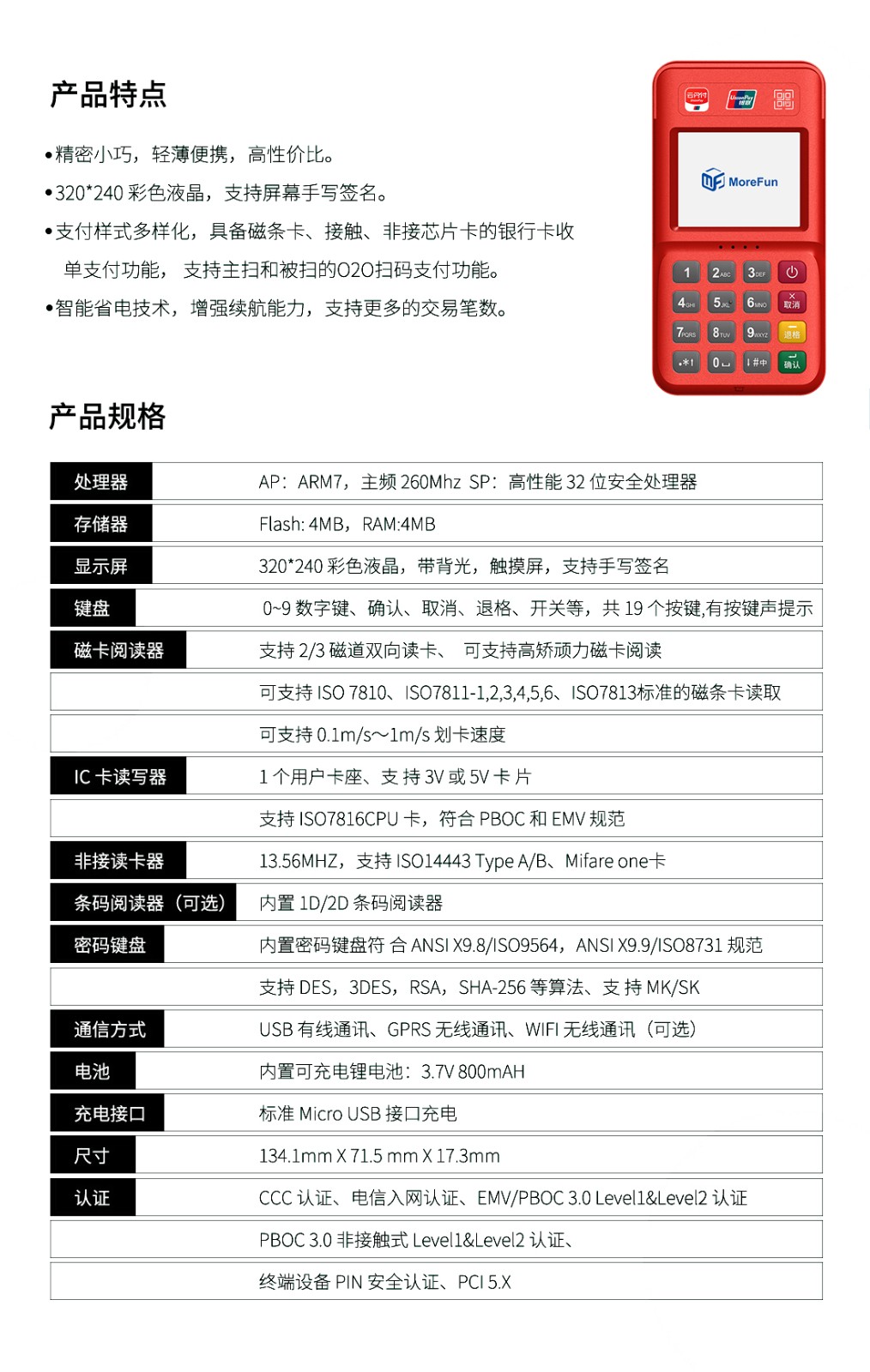 首页>>路南产品中心>>路南手持无线POS 路南联动优势-优POS Pro 高配版 * 性能优越:32位高性能ARM11安全CPU;整机通过业内更先进的PCI PED4.X 安全认证及国内受理终端PIN输入设备安全评估检测认证,多项措施保障金融交易的安全;* 时尚外观:外形小巧携带方便,高抗跌落性能、宽工作温度、防水防尘设计、外壳坚固耐刮、户外携带式作业更加耐久可靠。* 通讯备份:支持2G-3G扩展;* 超长续航:3.7V-800毫安稳定续航能力,智能电池管理保证持续工作18小时,待机72小时。 标准配置 返 回